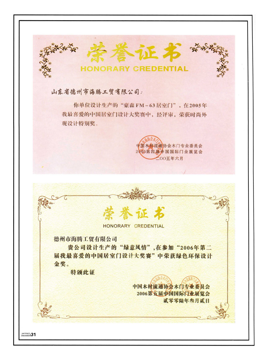 (3)防火:公共場所對室內門的防火性能非常重視,豪森產品材質采用的是高品質防火板,防火指標達到國家二級認證,可為消防撲救爭取更多的時間,這也是普通木門無法比擬的。